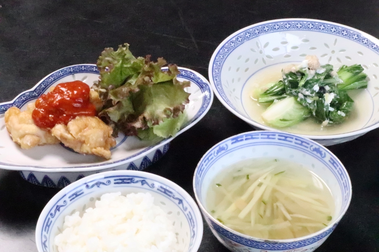 ☆ふんわり唐揚げに特性チリソースをかけた『鶏肉のチリソースかけ』を作ります。副菜は旬の青梗菜をカニの身と煮込んだ『青梗菜とカニの煮込み』に、スープは搾菜と根野菜の旨みを活かす『搾菜と根野菜のスープ』です!